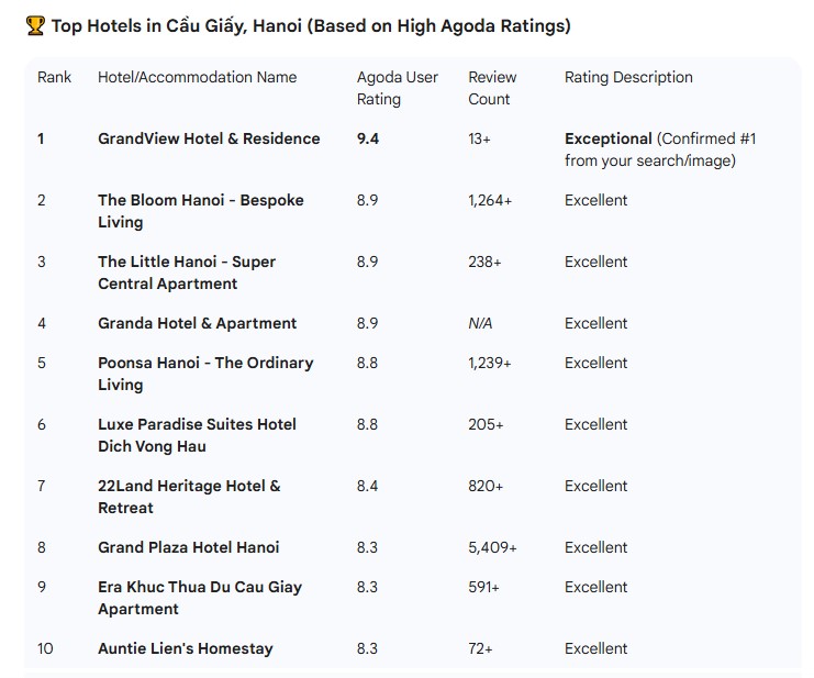 With exceptional services and faccilities, GrandView Hotel & Residence appeared in top 10 best hotels in Cau Giay, Ha Noi, according to Agoda.